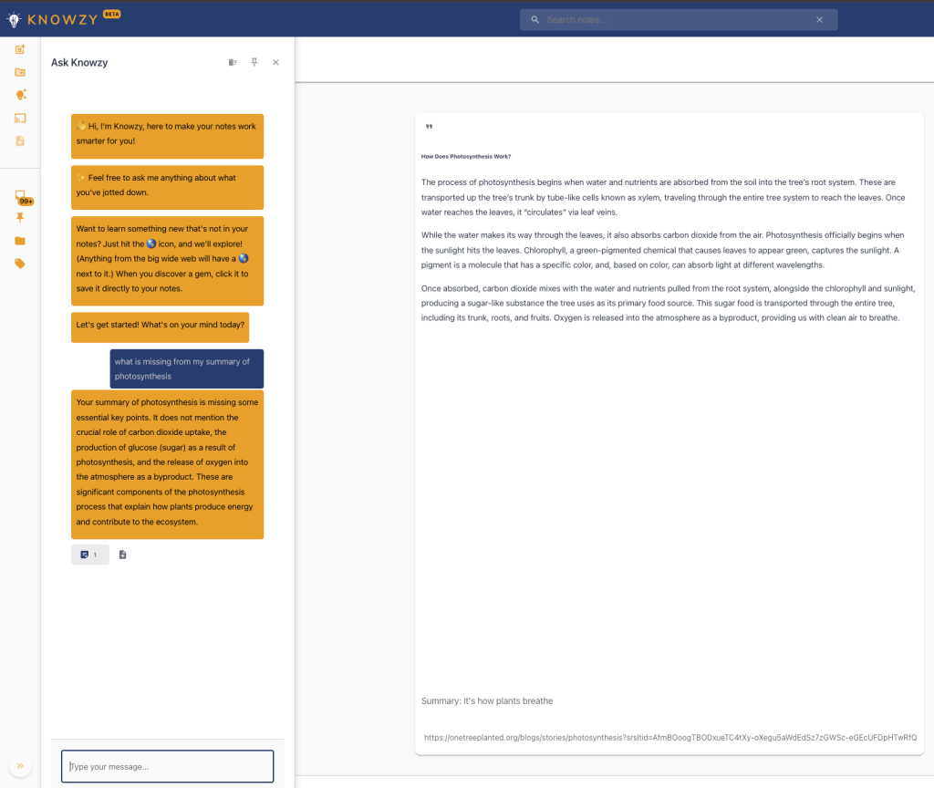 - Highlight the complex term in your original note and use the Ask Knowzy AI to say: “Explain this simply” or “Give me an analogy for this.”